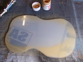 Step 6 - paint with enamel brown & put a small bit of sand in the on the acrylic then move it round so it hit's the edegs of the enamel paint .